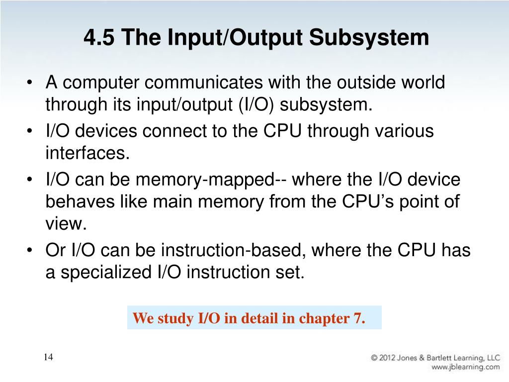 4.5 The Input/Output Subsystem • A computer communicates with the outside world through its input/output (I/O) subsystem. • I/O devices connect to the CPU through various interfaces. • I/O can be memory-mapped-- where the I/O device behaves like main memory from the CPU’s point of view. • Or I/O can be instruction-based, where the CPU has a specialized I/O instruction set. We study I/O in detail in chapter 7.