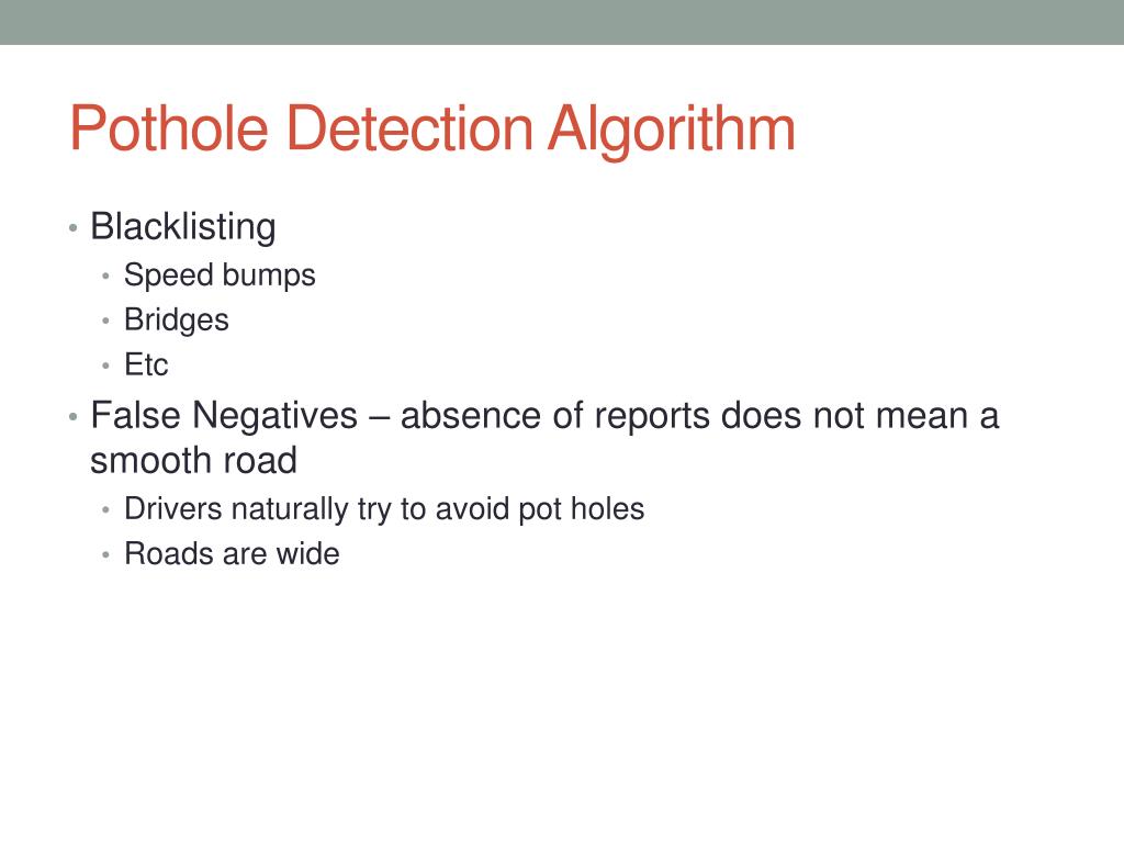 Pothole Detection Algorithm • Blacklisting • Speed bumps • Bridges • Etc • False Negatives – absence of reports does not mean a smooth road • Drivers naturally try to avoid pot holes • Roads are wide