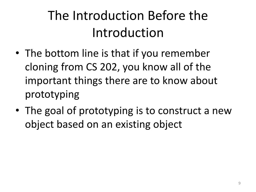 The Introduction Before the Introduction • The bottom line is that if you remember cloning from CS 202, you know all of the important things there are to know about prototyping • The goal of prototyping is to construct a new object based on an existing object