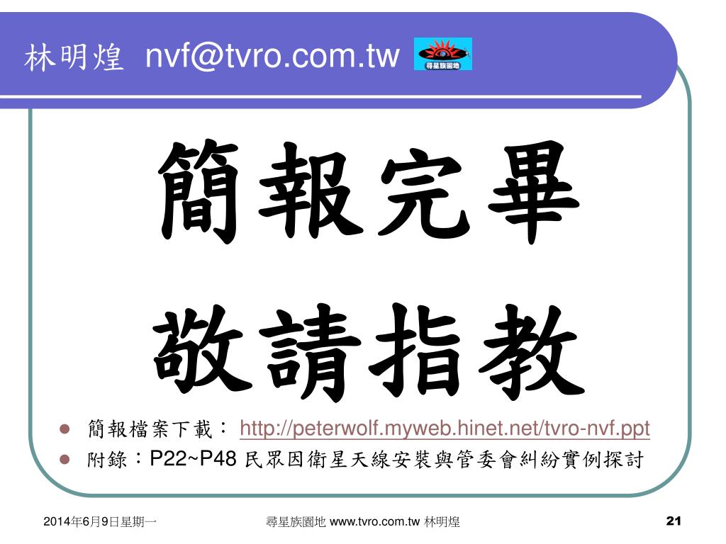 林明煌 nvf@tvro.com.tw 簡報完畢 敬請指教 • 簡報檔案下載: http://peterwolf.myweb.hinet.net/tvro-nvf.ppt • 附錄:P22~P48 民眾因衛星天線安裝與管委會糾紛實例探討 尋星族園地 www.tvro.com.tw 林明煌