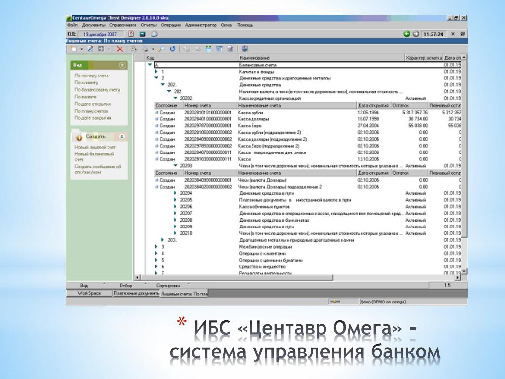 «Центавр Омега» – система, ориентированная главным образом на российские банки и инвестиционные компании. • Мультивалютность, работа во многих планах счетов, универсальная система отчетности, возможность легко национализировать систему, интеграция с российскими и международными платежными системами, включая SWIFT и национальные системы класса RTGS, позволяют использовать ИБС «Центавр Омега» для автоматизации различных финансовых организаций за пределами России. • Масштабируемость и гибкость системы позволяют применять ее в центральных банках, расчетных палатах, банках, обслуживающих предприятия и население, небанковских финансовых организациях. Система управления банком ИБС «Центавр Омега»