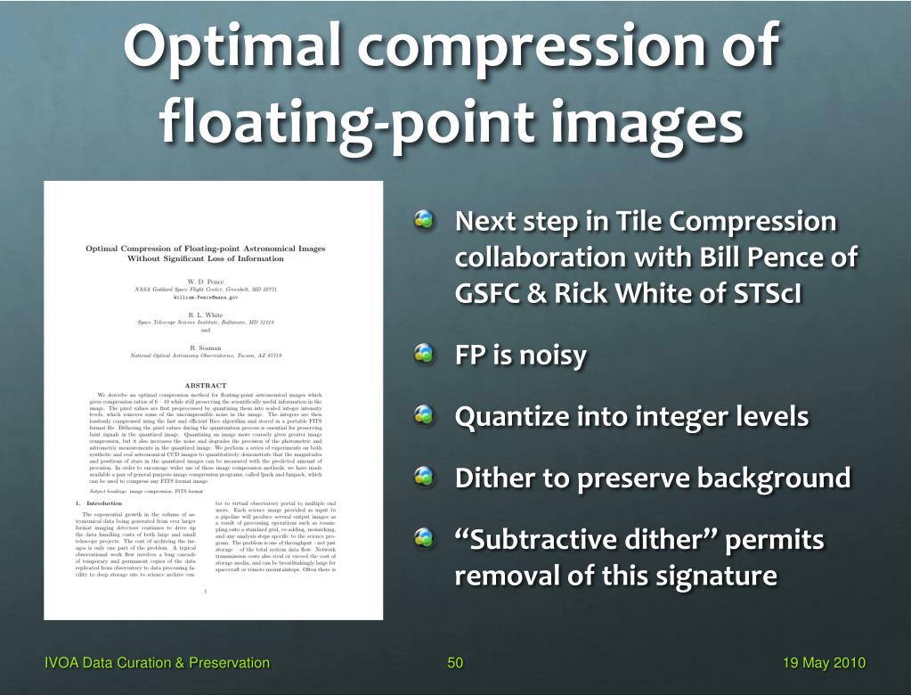Optimal compression of floating-point images • Next step in Tile Compression collaboration with Bill Pence of GSFC & Rick White of STScI • FP is noisy • Quantize into integer levels • Dither to preserve background • “Subtractive dither” permits removal of this signature IVOA Data Curation & Preservation