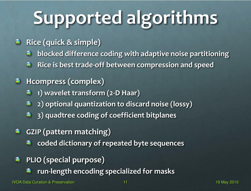 Supported algorithms • Rice (quick & simple) • blocked difference coding with adaptive noise partitioning • Rice is best trade-off between compression and speed • Hcompress (complex) • 1) wavelet transform (2-D Haar) • 2) optional quantization to discard noise (lossy) • 3) quadtree coding of coefficient bitplanes • GZIP (pattern matching) • coded dictionary of repeated byte sequences • PLIO (special purpose) • run-length encoding specialized for masks IVOA Data Curation & Preservation