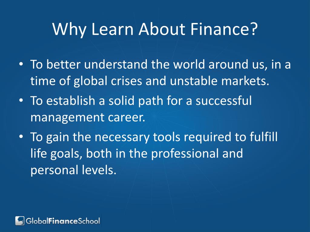 Why Learn About Finance? To better understand the world around us, in a time of global crises and unstable markets. To establish a solid path for a successful management career. To gain the necessary tools required to fulfill life goals, both in the professional and personal levels.