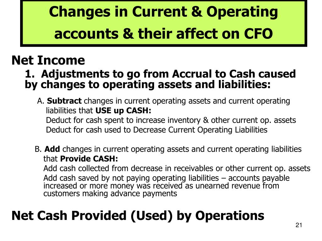 Changes in Current & Operating accounts & their affect on CFO Net Income 1. Adjustments to go from Accrual to Cash caused by changes to operating assets and liabilities: A. Subtract changes in current operating assets and current operating liabilities that USE up CASH: Deduct for cash spent to increase inventory & other current op. assets Deduct for cash used to Decrease Current Operating Liabilities B. Add changes in current operating assets and current operating liabilities that Provide CASH: Add cash collected from decrease in receivables or other current op. assets Add cash saved by not paying operating liabilities – accounts payable increased or more money was received as unearned revenue from customers making advance payments Net Cash Provided (Used) by Operations