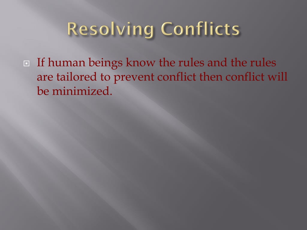 Resolving Conflicts • If human beings know the rules and the rules are tailored to prevent conflict then conflict will be minimized.