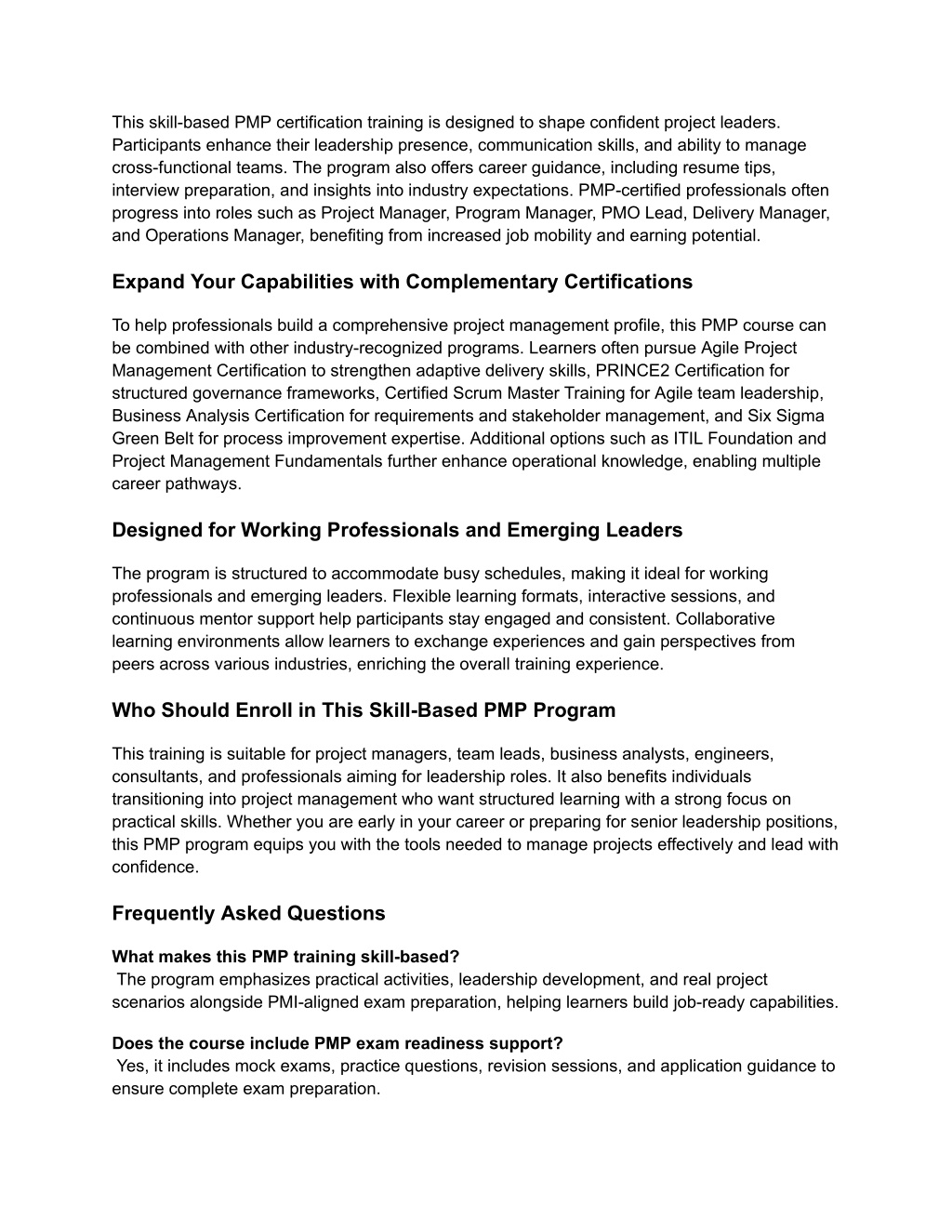 hands-on learning aligned with PMI standards. Designed for current and aspiring project leaders, the training helps participants build confidence in managing complex initiatives, leading diverse teams, and delivering measurable business results. Why Skill-Based Learning Matters for Project Leaders Modern project leaders are expected to do more than follow processes. They must communicate clearly, resolve conflicts, manage risks, and guide teams through uncertainty. This skill-based PMP program focuses on these core competencies while covering the full PMP syllabus. Learners develop expertise in planning, execution, monitoring, and closing projects, along with soft skills such as stakeholder engagement, negotiation, and decision-making. This balanced approach ensures participants are prepared for both the PMP exam and real-world leadership challenges. PMI-Aligned Curriculum with Practical Application The curriculum follows PMI’s latest Exam Content Outline and addresses the People, Process, and Business Environment domains in depth. Participants learn project integration, scope definition, scheduling techniques, cost management, quality planning, procurement strategies, communication frameworks, and stakeholder management. Agile and Hybrid methodologies are also covered, including Scrum ceremonies, backlog prioritization, adaptive planning, and incremental delivery. Every topic is reinforced with practical examples, ensuring learners understand how PMP concepts apply in professional environments. Hands-On Skill Development Through Real Project Activities This PMP training emphasizes experiential learning through exercises, case discussions, and guided activities. Learners practice building project charters, work breakdown structures, risk registers, and performance dashboards. They also simulate change management scenarios, resource allocation challenges, and stakeholder negotiations. These activities strengthen analytical thinking, improve problem-solving abilities, and help participants gain confidence in leading projects across industries such as IT, healthcare, finance, manufacturing, and construction. Structured Exam Preparation with Continuous Support Alongside skill development, the program provides complete PMP exam preparation. Participants receive guidance on eligibility requirements, application processes, and exam strategies. The course includes mock tests, scenario-based practice questions, and focused revision sessions aligned with real PMP exam formats. Continuous assessments help identify improvement areas early, allowing trainers to provide targeted support. This structured approach ensures learners are well-prepared to pass the PMP exam while building practical expertise. Leadership Development for Career Advancement