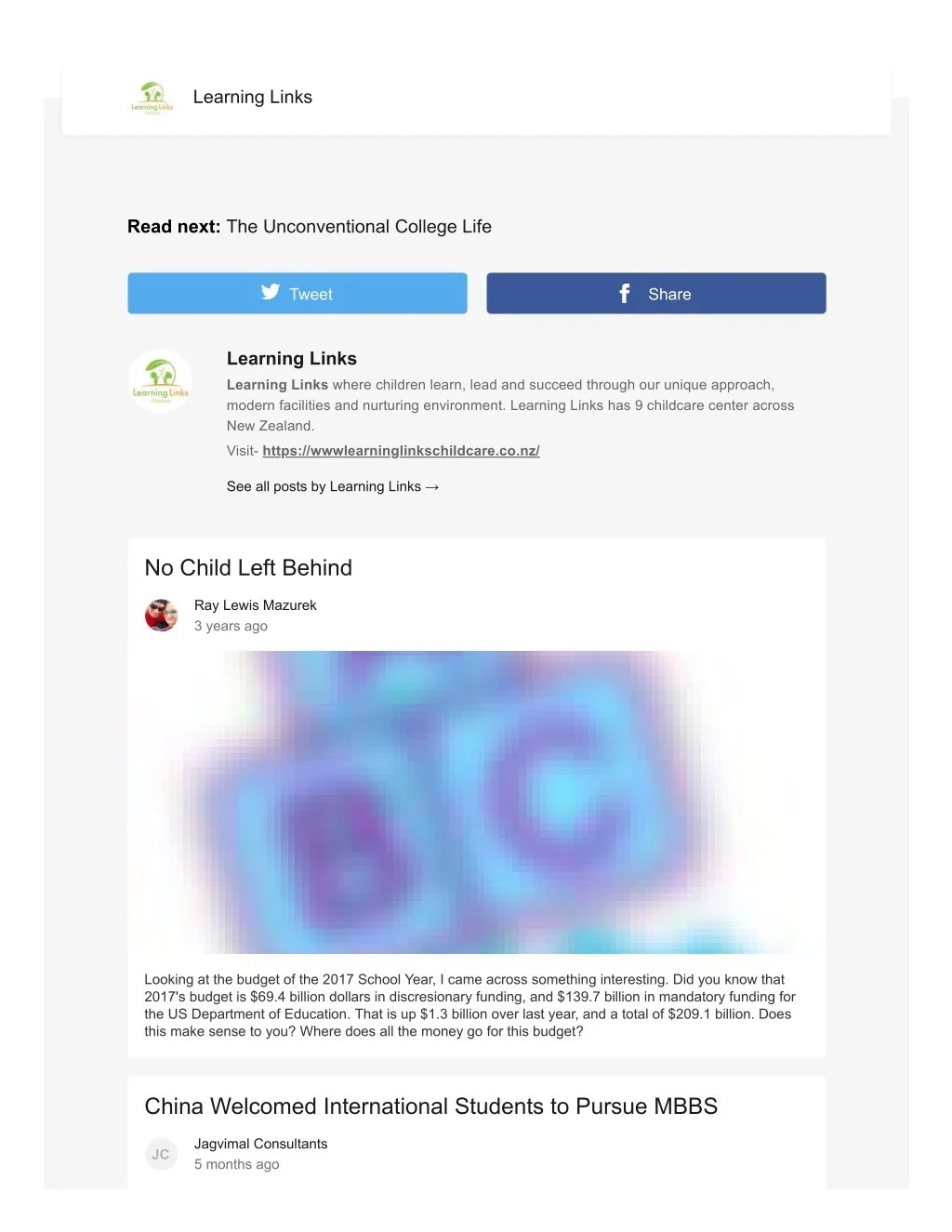 Learning Links Read next: The Unconventional College Life Tweet Share Learning Links Learning Links where children learn, lead and succeed through our unique approach, modern facilities and nurturing environment. Learning Links has 9 childcare center across New Zealand. Visit- https://wwwlearninglinkschildcare.co.nz/ See all posts by Learning Links → No Child Left Behind Ray Lewis Mazurek 3 years ago Looking at the budget of the 2017 School Year, I came across something interesting. Did you know that 2017's budget is $69.4 billion dollars in discresionary funding, and $139.7 billion in mandatory funding for the US Department of Education. That is up $1.3 billion over last year, and a total of $209.1 billion. Does this make sense to you? Where does all the money go for this budget? China Welcomed International Students to Pursue MBBS Jagvimal Consultants 5 months ago JC