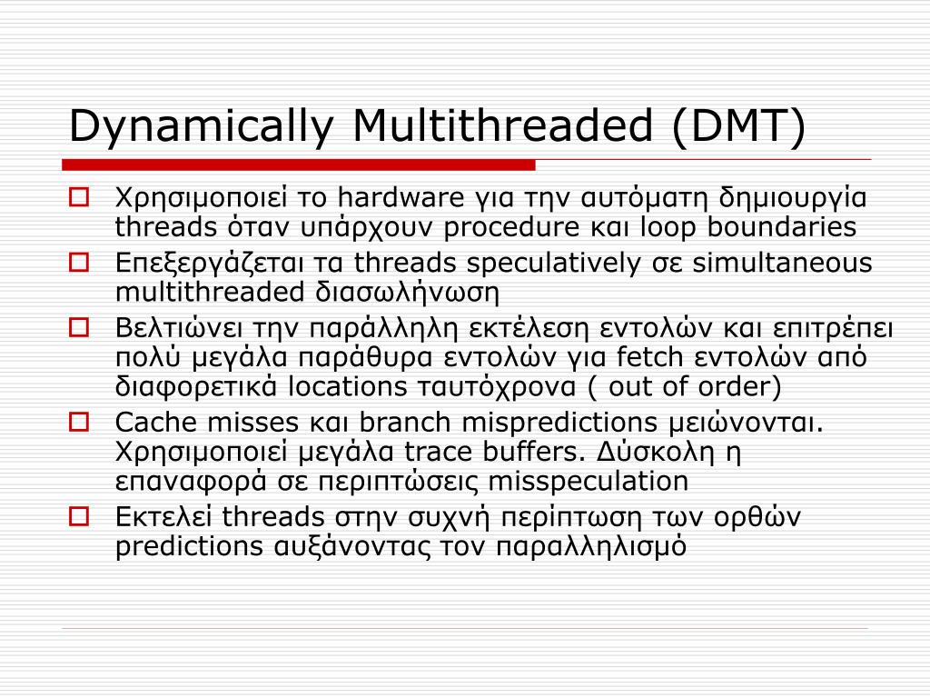 Dynamically Multithreaded (DMT) • Χρησιμοποιεί το hardware για την αυτόματη δημιουργία threads όταν υπάρχουν procedure και loop boundaries • Επεξεργάζεται τα threads speculatively σε simultaneous multithreaded διασωλήνωση • Βελτιώνει την παράλληλη εκτέλεση εντολών και επιτρέπει πολύ μεγάλα παράθυρα εντολών για fetch εντολών από διαφορετικά locations ταυτόχρονα ( out of order) • Cache misses και branch mispredictions μειώνονται. Χρησιμοποιεί μεγάλα trace buffers. Δύσκολη η επαναφορά σε περιπτώσεις misspeculation • Εκτελεί threads στην συχνή περίπτωση των ορθών predictions αυξάνοντας τον παραλληλισμό