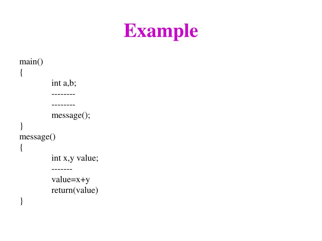 Example main() { int a,b; -------- -------- message(); } message() { int x,y value; ------- value=x+y return(value) }