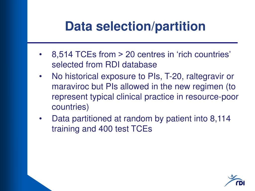 Data selection/partition • 8,514 TCEs from > 20 centres in ‘rich countries’ selected from RDI database • No historical exposure to PIs, T-20, raltegravir or maraviroc but PIs allowed in the new regimen (to represent typical clinical practice in resource-poor countries) • Data partitioned at random by patient into 8,114 training and 400 test TCEs