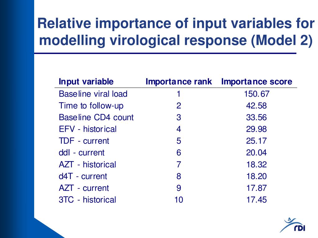 Conclusions • Models trained with large, representative datasets can predict virological response to cART accurately without a genotype. • The results highlight viral load as the most important variable in modelling response • Models are able to identify potentially effective 3-drug regimens comprising older drugs in a substantial proportion of failures • This approach has potential for optimising antiretroviral therapy in resource-poor countries