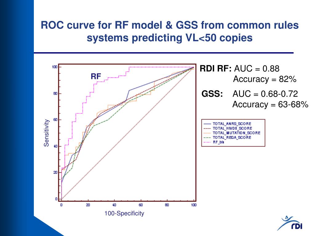 ROC curve for RF model & GSS from common rules systems predicting VL<50 copies RDI RF: AUC = 0.88 Accuracy = 82% RF GSS: AUC = 0.68-0.72 Accuracy = 63-68% Sensitivity 100-Specificity