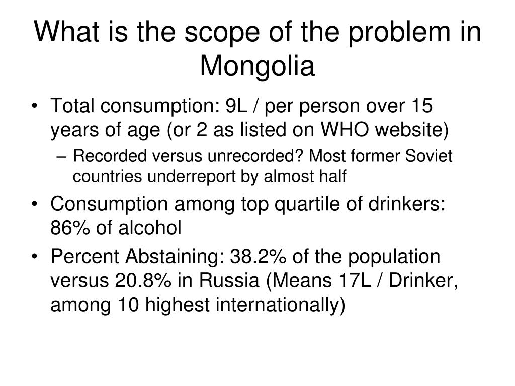 What is the scope of the problem in Mongolia • Drinking problems are compared internationally on the basis of several key indicators: Total consumption (L/year), Consumption among the top quartile of heaviest drinkers, Percent abstaining, Type of alcohol consumed, Percent binge drinking (weekly) • These comparison approach the issue from the medical perspective
