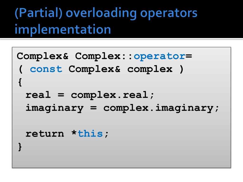 (Partial) overloading operators implementation Complex& Complex::operator= ( const Complex& complex ) { real = complex.real; imaginary = complex.imaginary; return *this; }