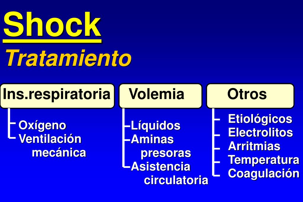 Shock Tratamiento Ins.respiratoria Volemia Otros Etiológicos Electrolitos Arritmias Temperatura Coagulación Oxígeno Ventilación mecánica Líquidos Aminas presoras Asistencia circulatoria