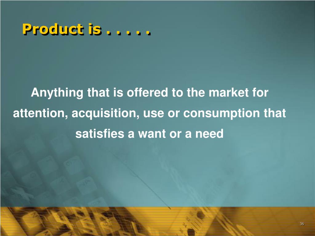 Product is . . . . . Anything that is offered to the market for attention, acquisition, use or consumption that satisfies a want or a need