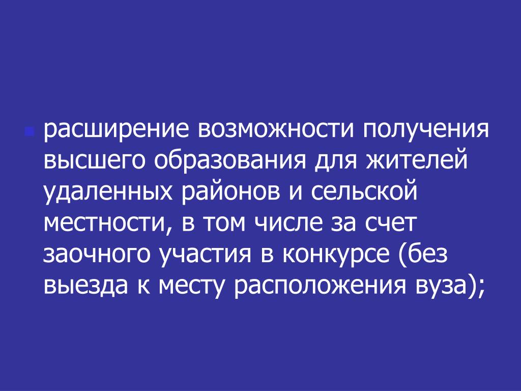 Проведение эксперимента привело к ряду положительных эффектов, наиболее значимыми из которых следует считать: • расширение возможности получения высшего образования для жителей удаленных районов и сельской местности, в том числе за счет заочного участия в конкурсе (без выезда к месту расположения вуза);