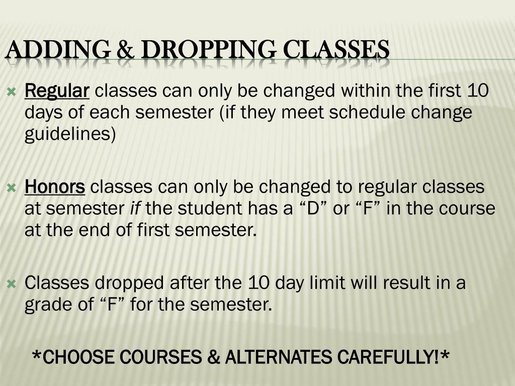 Regular classes can only be changed within the first 10 days of each semester (if they meet schedule change guidelines) • Honorsclasses can only be changed to regular classes at semester if the student has a “D” or “F” in the course at the end of first semester. • Classes dropped after the 10 day limit will result in a grade of “F” for the semester. *CHOOSE COURSES & ALTERNATES CAREFULLY!* ADDING & DROPPING CLASSES