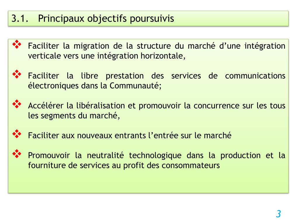 3.1. Principaux objectifs poursuivis • Faciliter la migration de la structure du marché d’une intégration verticale vers une intégration horizontale, • Faciliter la libre prestation des services de communications électroniques dans la Communauté; • Accélérer la libéralisation et promouvoir la concurrence sur les tous les segments du marché, • Faciliter aux nouveaux entrants l’entrée sur le marché • Promouvoir la neutralité technologique dans la production et la fourniture de services au profit des consommateurs
