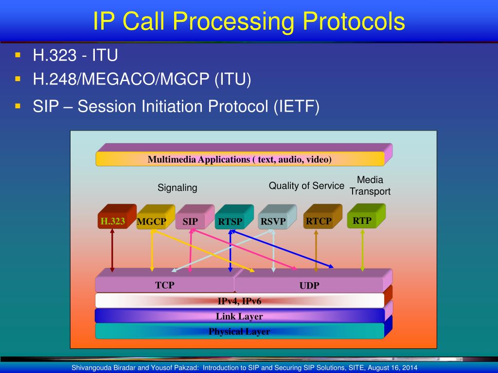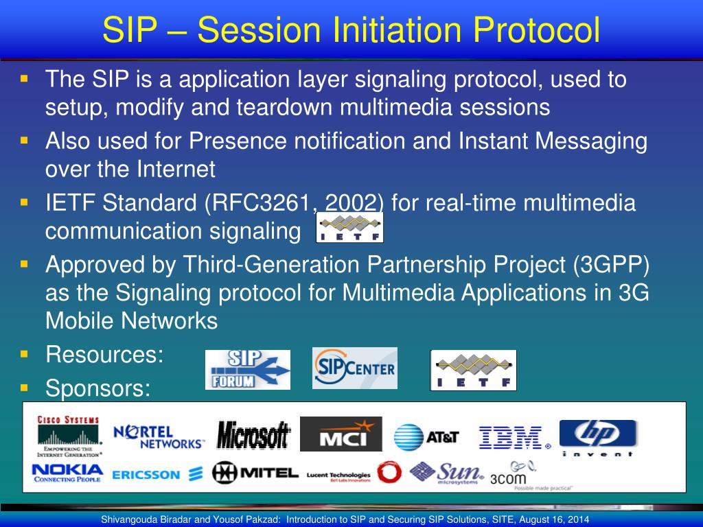 Multimedia Communications:Introduction to SIP and Securing SIP Solutions Presented by: Shivanagouda Biradar Yousof Pakzad August 16, 2014 School of Information Technology and Engineering (SITE), University of Ottawa This presentation is submitted to Prof. El Saddik in partial fulfillment of the requirements for the course ELG 5121: Multimedia Communications