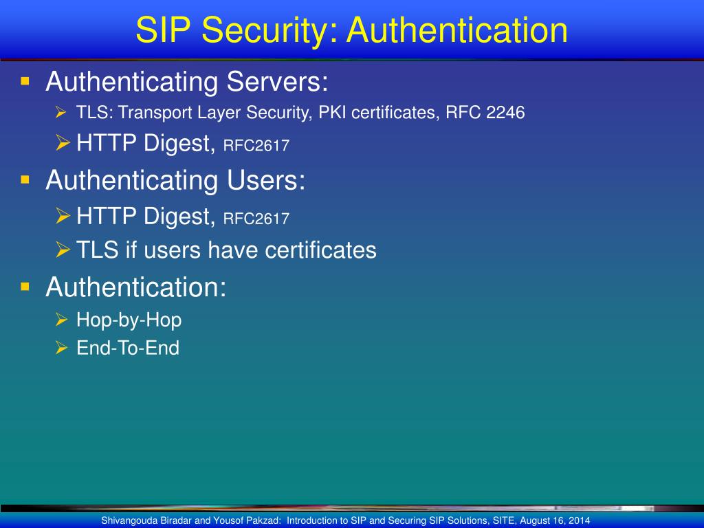 SIP Security: Authentication • Authenticating Servers: • TLS: Transport Layer Security, PKI certificates, RFC 2246 • HTTP Digest, RFC2617 • Authenticating Users: • HTTP Digest, RFC2617 • TLS if users have certificates • Authentication: • Hop-by-Hop • End-To-End