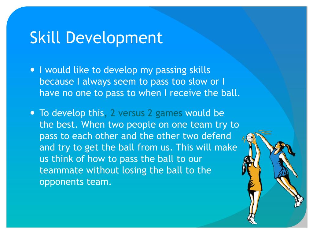 Skill Development • I would like to develop my passing skills because I always seem to pass too slow or I have no one to pass to when I receive the ball. • To develop this, 2 versus 2 games would be the best. When two people on one team try to pass to each other and the other two defend and try to get the ball from us. This will make us think of how to pass the ball to our teammate without losing the ball to the opponents team.