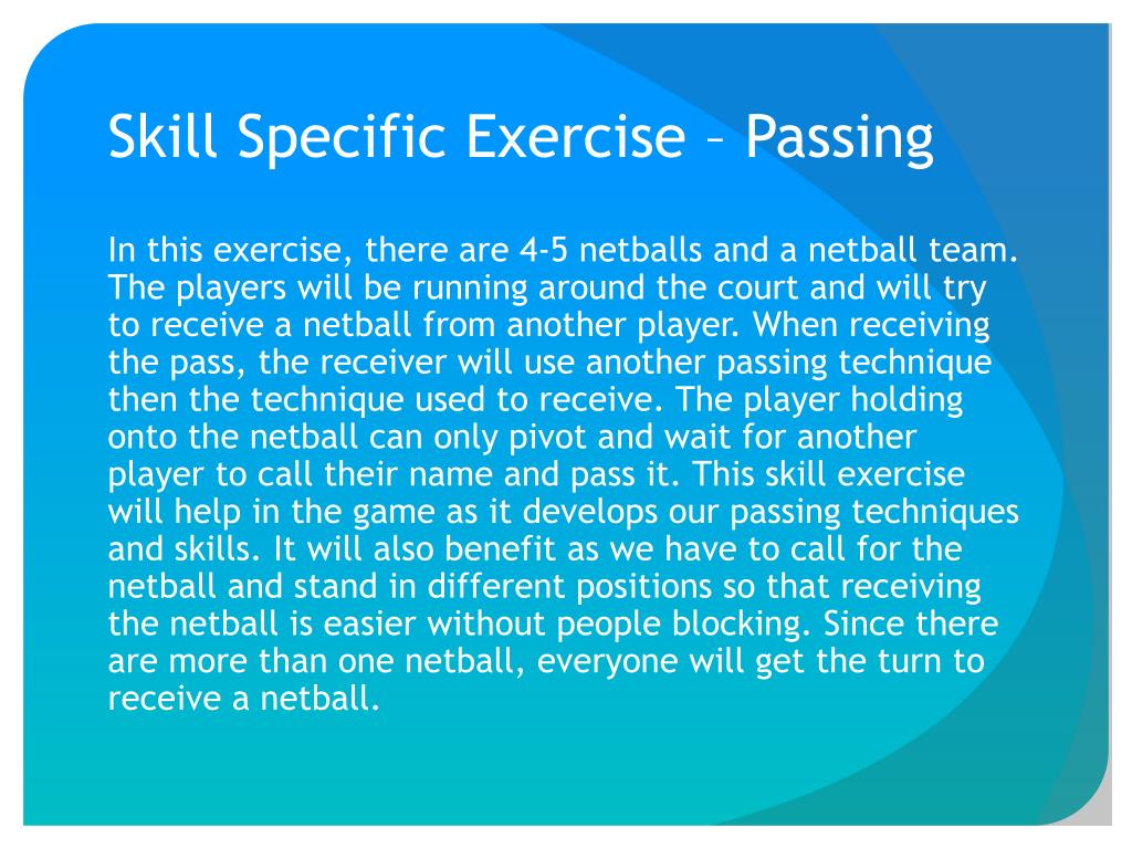 Skill Specific Exercise – Passing In this exercise, there are 4-5 netballs and a netball team. The players will be running around the court and will try to receive a netball from another player. When receiving the pass, the receiver will use another passing technique then the technique used to receive. The player holding onto the netball can only pivot and wait for another player to call their name and pass it. This skill exercise will help in the game as it develops our passing techniques and skills. It will also benefit as we have to call for the netball and stand in different positions so that receiving the netball is easier without people blocking. Since there are more than one netball, everyone will get the turn to receive a netball.