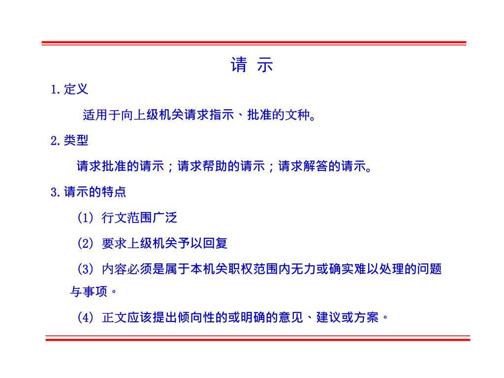 请 示 1.定义 适用于向上级机关请求指示、批准的文种。 2.类型 请求批准的请示;请求帮助的请示;请求解答的请示。 3.请示的特点 (1)行文范围广泛 (2)要求上级机关予以回复 (3)内容必须是属于本机关职权范围内无力或确实难以处理的问题 与事项。 (4)正文应该提出倾向性的或明确的意见、建议或方案。