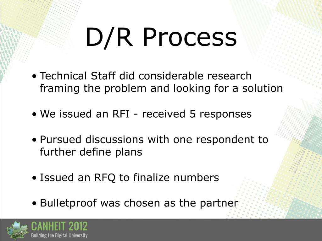 D/R Process • Technical Staff did considerable research framing the problem and looking for a solution • We issued an RFI - received 5 responses • Pursued discussions with one respondent to further define plans • Issued an RFQ to finalize numbers • Bulletproof was chosen as the partner