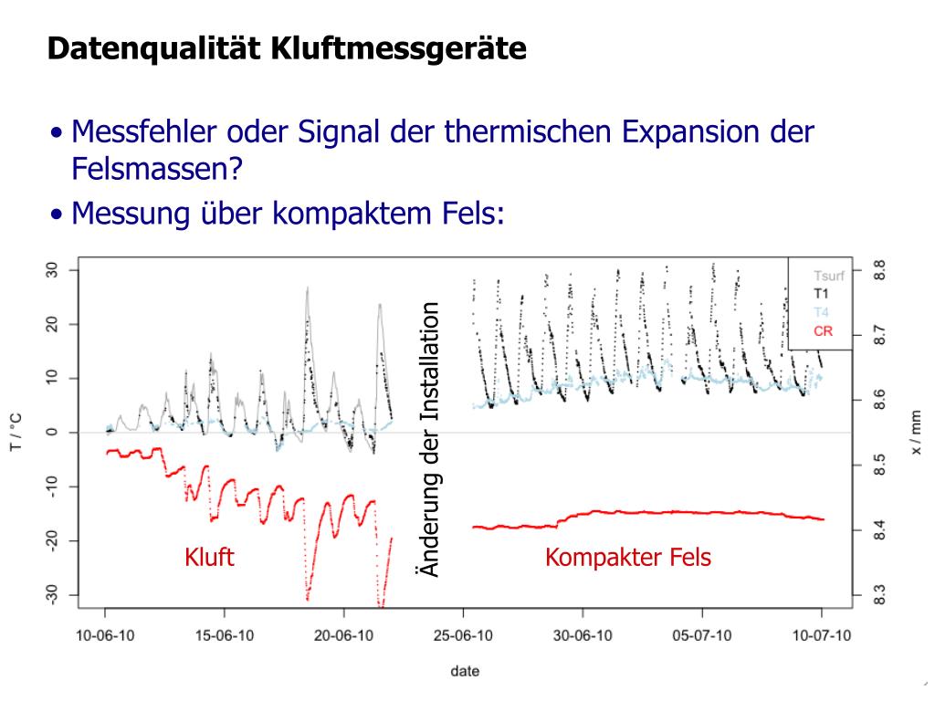 Datenqualität Kluftmessgeräte • Messfehler oder Signal der thermischen Expansion der Felsmassen? • Messung über kompaktem Fels: Änderung der Installation Kluft Kompakter Fels