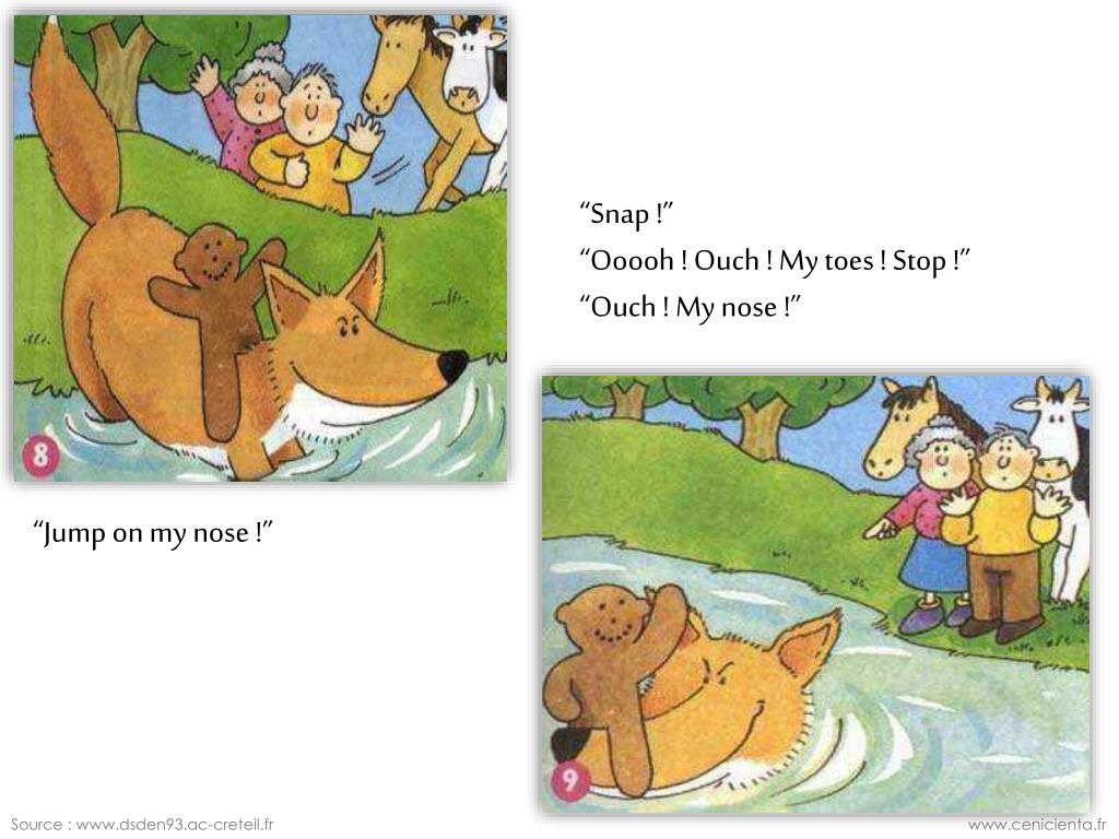 “Snap !” • “Ooooh! Ouch ! My toes ! Stop !” • “Ouch ! My nose !” • “Jump on my nose !”