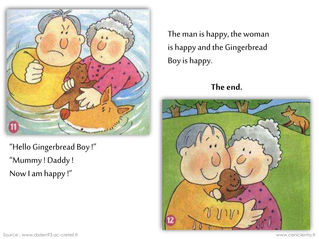 The man is happy, the woman is happy and the Gingerbread Boy is happy. The end. “Hello Gingerbread Boy !” “Mummy ! Daddy ! Now I am happy !”