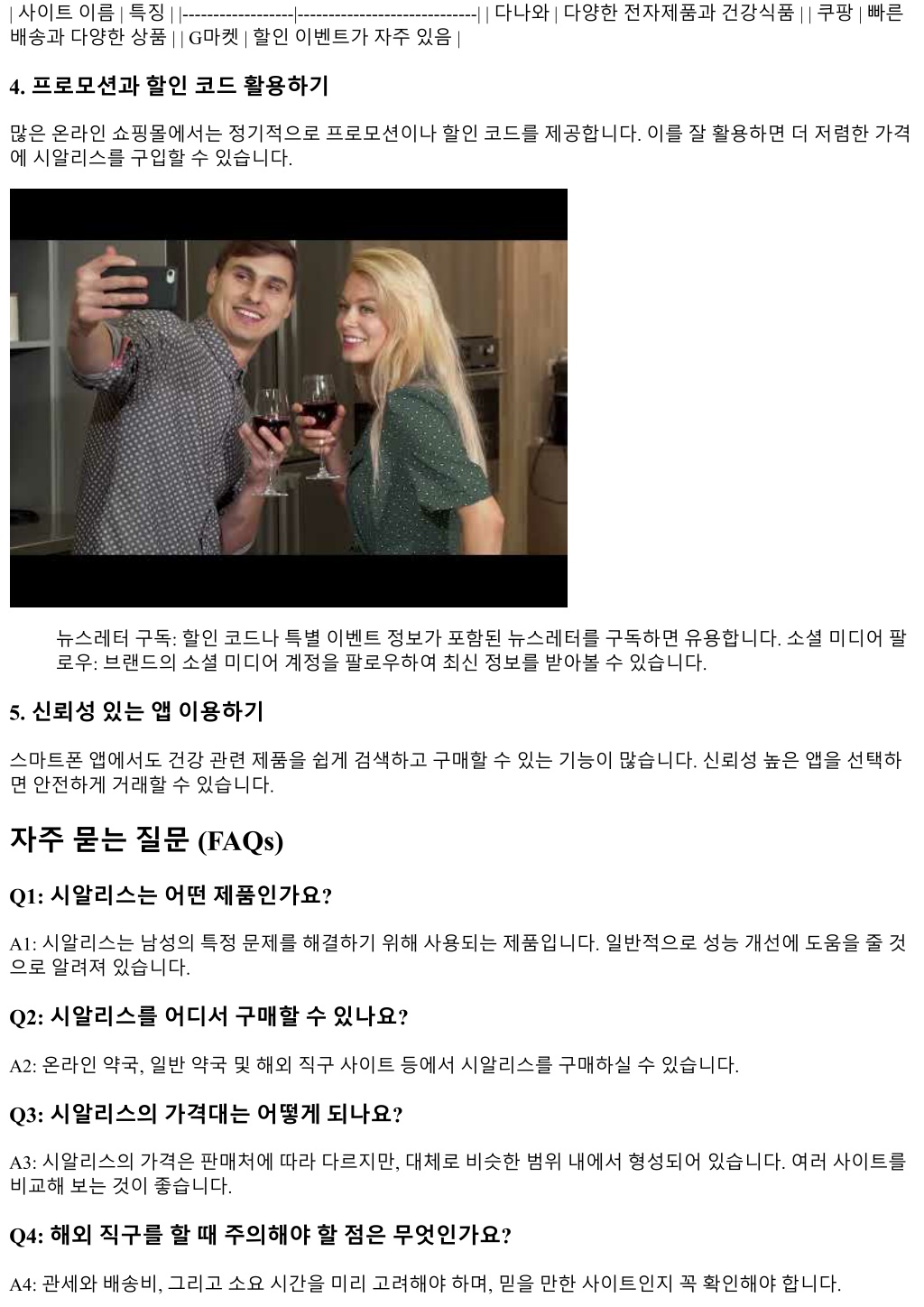 2. | 사이트이름 | 특징 | |------------------|-----------------------------| | 다나와 | 다양한전자제품과건강식품 | | 쿠팡 | 빠른 배송과다양한상품 | | G마켓 | 할인이벤트가자주있음 | 4. 프로모션과할인코드활용하기 많은온라인쇼핑몰에서는정기적으로프로모션이나할인코드를제공합니다. 이를잘활용하면더저렴한가격 에시알리스를구입할수있습니다. 뉴스레터구독: 할인코드나특별이벤트정보가포함된뉴스레터를구독하면유용합니다. 소셜미디어팔 로우: 브랜드의소셜미디어계정을팔로우하여최신정보를받아볼수있습니다. 5. 신뢰성있는앱이용하기 스마트폰앱에서도건강관련제품을쉽게검색하고구매할수있는기능이많습니다. 신뢰성높은앱을선택하 면안전하게거래할수있습니다. 자주묻는질문 (FAQs) Q1: 시알리스는어떤제품인가요? A1: 시알리스는남성의특정문제를해결하기위해사용되는제품입니다. 일반적으로성능개선에도움을줄것 으로알려져있습니다. Q2: 시알리스를어디서구매할수있나요? A2: 온라인약국, 일반약국및해외직구사이트등에서시알리스를구매하실수있습니다. Q3: 시알리스의가격대는어떻게되나요? A3: 시알리스의가격은판매처에따라다르지만, 대체로비슷한범위내에서형성되어있습니다. 여러사이트를 비교해보는것이좋습니다. Q4: 해외직구를할때주의해야할점은무엇인가요? A4: 관세와배송비, 그리고소요시간을미리고려해야하며, 믿을만한사이트인지꼭확인해야합니다.