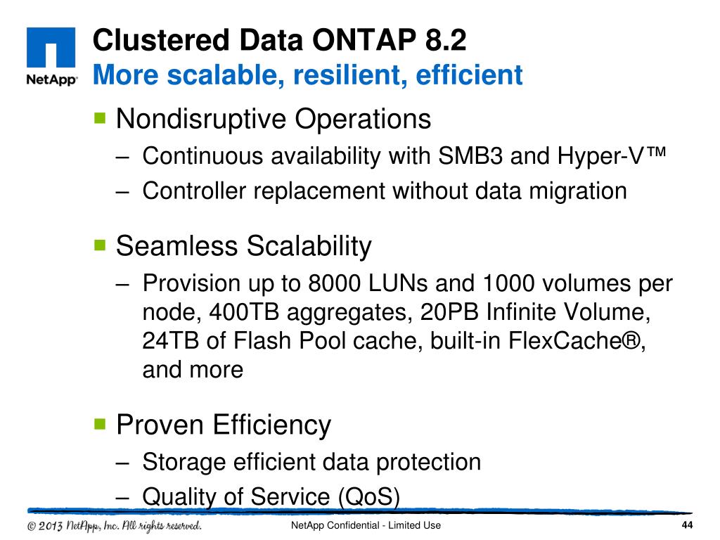 Clustered Data ONTAP 8.2More scalable, resilient, efficient • Nondisruptive Operations • Continuous availability with SMB3 and Hyper-V™ • Controller replacement without data migration • Seamless Scalability • Provision up to 8000 LUNs and 1000 volumes per node, 400TB aggregates, 20PB Infinite Volume, 24TB of Flash Pool cache, built-in FlexCache®, and more • Proven Efficiency • Storage efficient data protection • Quality of Service (QoS) NetApp Confidential - Limited Use