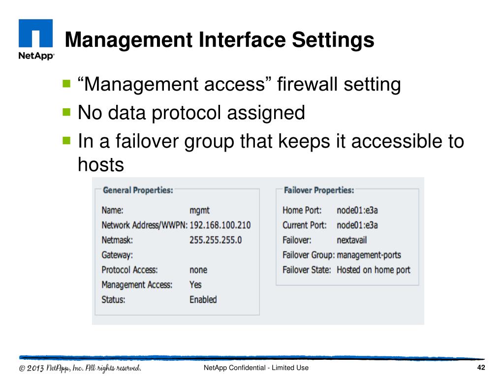 Management Interface Settings “Management access” firewall setting No data protocol assigned In a failover group that keeps it accessible to hosts NetApp Confidential - Limited Use