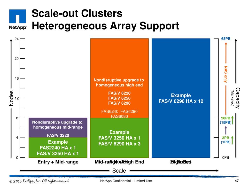 Scale-out ClustersHeterogeneous Array Support 68PB 24 Nondisruptive upgrade to homogeneous high end FAS/V 6220 FAS/V 6250 FAS/V 6290 FAS6240, FAS6280 FAS6080 Example FAS/V 6290 HA x 12 20 NAS only 16 Capacity (Marketed) Nodes 12 8 20PB Nondisruptive upgrade to homogeneous mid-range FAS/V 3220 FAS3250 FAS3270 FAS6210, FAS6040 Example FAS/V 3250 HA x 1 FAS/V 6290 HA x 3 (15PB) 4 3PB Example FAS2240 HA x 1 FAS/V 3250 HA x 1 (1PB) 0PB 0 8 Nodes Entry + Mid-range Mid-range + High End High End 24 Nodes Scale NetApp Confidential - Limited Use