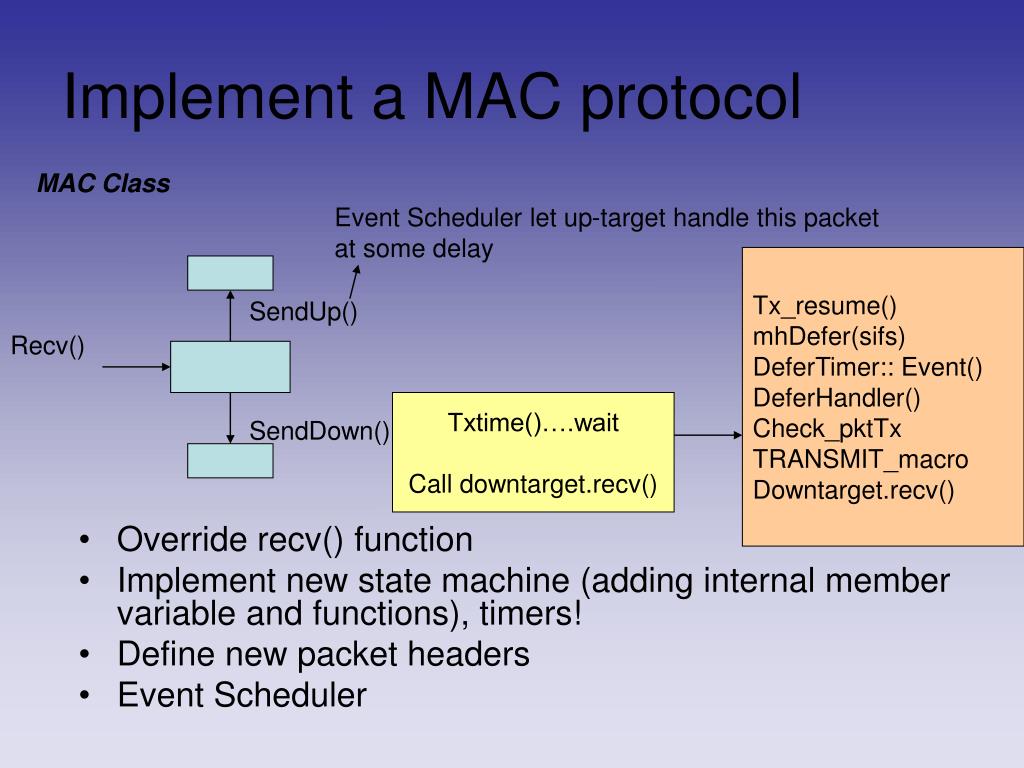 Implement a MAC protocol MAC Class • Override recv() function • Implement new state machine (adding internal member variable and functions), timers! • Define new packet headers • Event Scheduler Event Scheduler let up-target handle this packet at some delay Tx_resume() mhDefer(sifs) DeferTimer:: Event() DeferHandler() Check_pktTx TRANSMIT_macro Downtarget.recv() SendUp() Recv() Txtime()….wait Call downtarget.recv() SendDown()