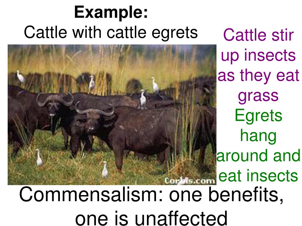 Example:Cattle with cattle egrets Cattle stir up insects as they eat grassEgrets hang around and eat insects Commensalism: one benefits, one is unaffected
