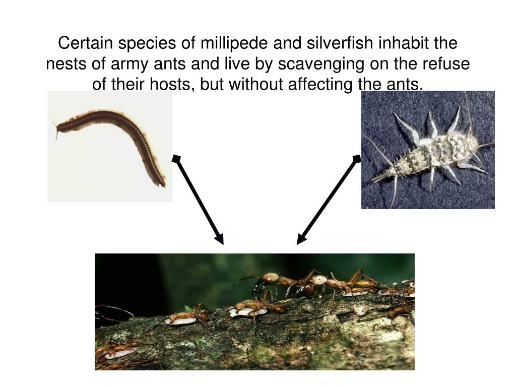 Certain species of millipede and silverfish inhabit the nests of army ants and live by scavenging on the refuse of their hosts, but without affecting the ants.