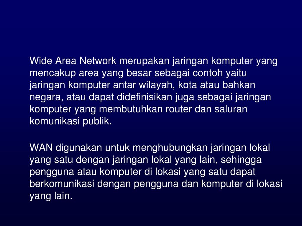 WIDE AREA NETWORK (WAN). Wide Area Network merupakan jaringan komputer yang mencakup area yang besar sebagai contoh yaitu jaringan komputer antar wilayah, kota atau bahkan negara, atau dapat didefinisikan juga sebagai jaringan komputer yang membutuhkan router dan saluran komunikasi publik.