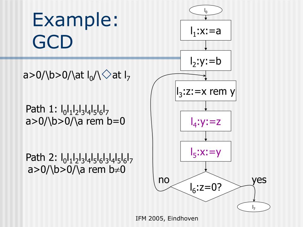 l0 Example: GCD l1:x:=a l2:y:=b a>0/\b>0/\at l0/\at l7 l3:z:=x rem y Path 1: l0l1l2l3l4l5l6l7a>0/\b>0/\a rem b=0 Path 2: l0l1l2l3l4l5l6l3l4l5l6l7a>0/\b>0/\a rem b0 l4:y:=z l5:x:=y no l6:z=0? yes l7 IFM 2005, Eindhoven