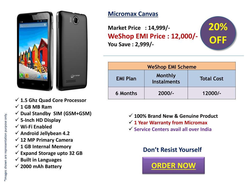 Micromax Canvas. 20% OFF. Market Price : 14,999/- WeShop EMI Price : 12,000/- You Save : 2,999/-. 1.5 Ghz Quad Core Processor 1 GB MB Ram Dual Standby SIM (GSM+GSM) 5-Inch HD Display Wi-Fi Enabled Android Jellybean 4.2 12 MP Primary Camera 1 GB Internal Memory