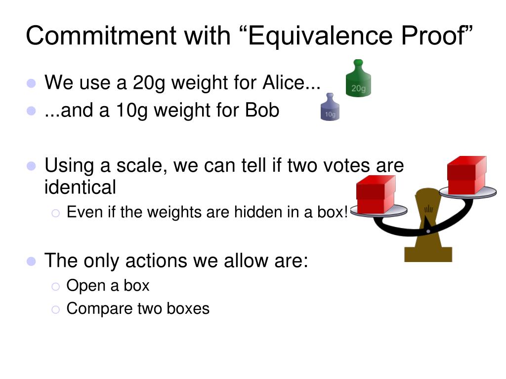 Commitment with “Equivalence Proof” • We use a 20g weight for Alice... • ...and a 10g weight for Bob • Using a scale, we can tell if two votes are identical • Even if the weights are hidden in a box! • The only actions we allow are: • Open a box • Compare two boxes