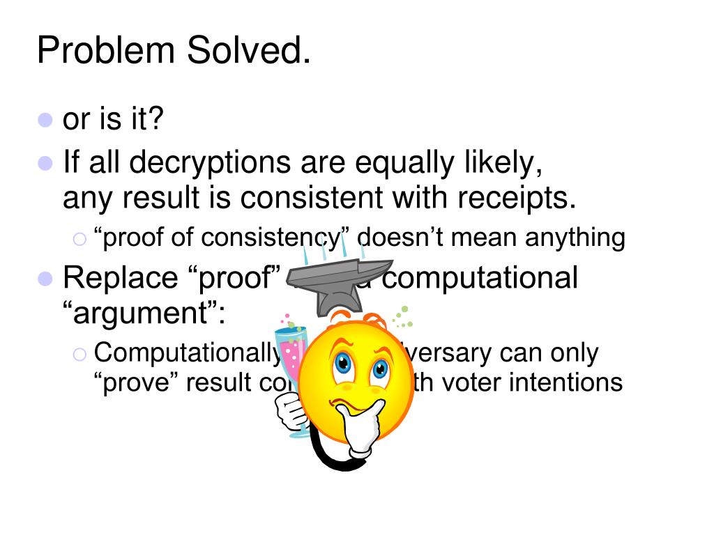 Problem Solved. • or is it? • If all decryptions are equally likely,any result is consistent with receipts. • “proof of consistency” doesn’t mean anything • Replace “proof” with a computational “argument”: • Computationally bound adversary can only “prove” result consistent with voter intentions