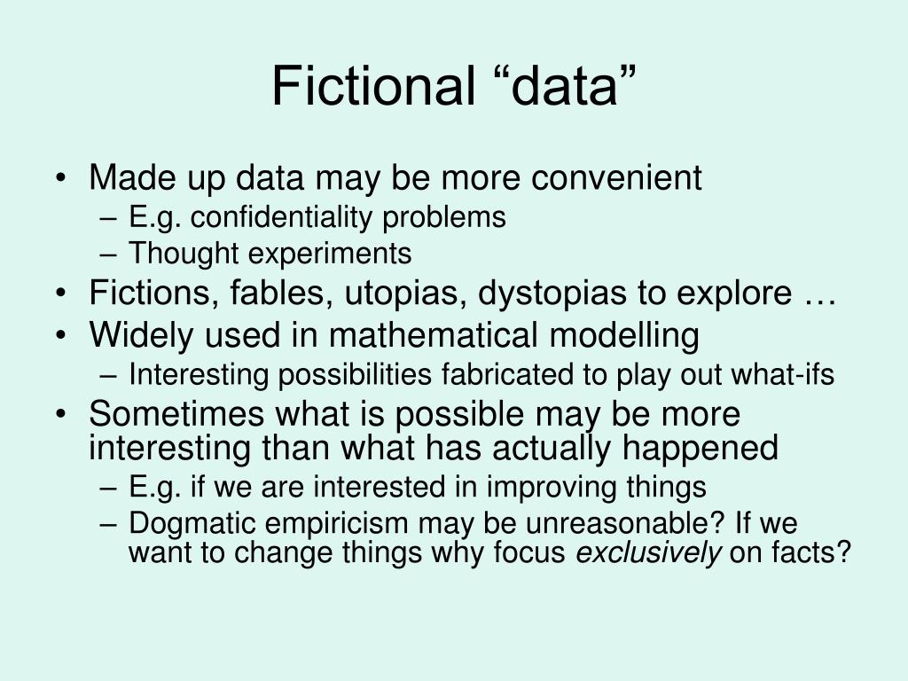 Fictional “data” • Made up data may be more convenient • E.g. confidentiality problems • Thought experiments • Fictions, fables, utopias, dystopias to explore … • Widely used in mathematical modelling • Interesting possibilities fabricated to play out what-ifs • Sometimes what is possible may be more interesting than what has actually happened • E.g. if we are interested in improving things • Dogmatic empiricism may be unreasonable? If we want to change things why focus exclusively on facts?