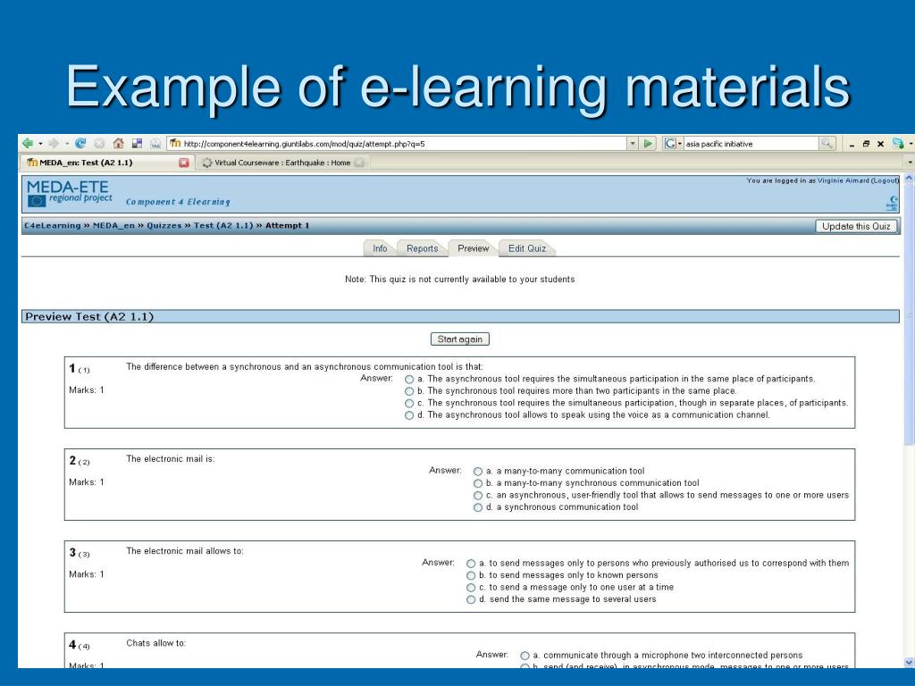 Definition of e-learning Using computer technologies for learning related purposes So what does it mean concretely ???