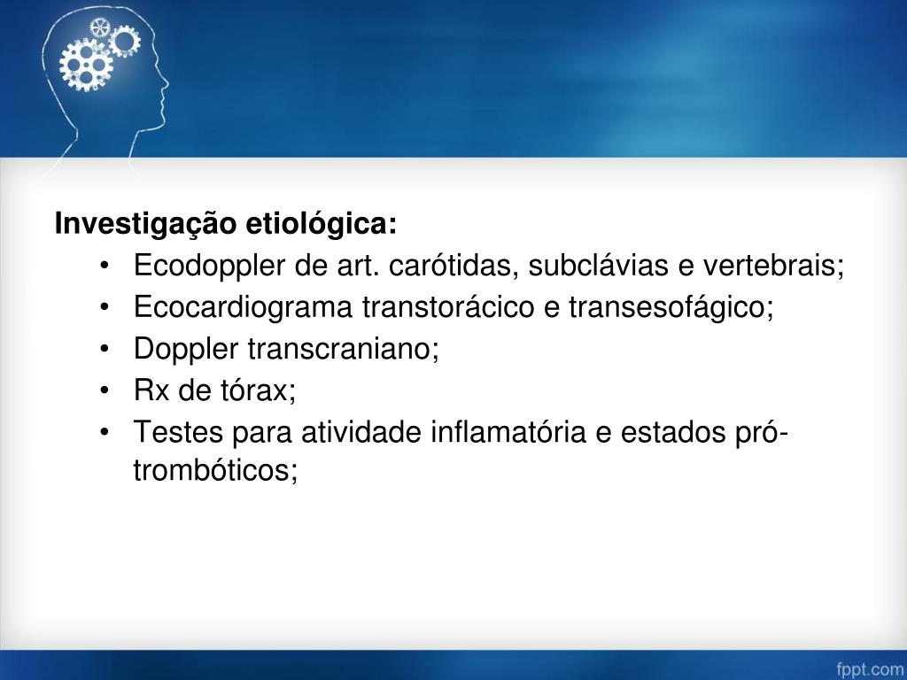 Investigação etiológica: • Ecodopplerde art. carótidas, subclávias e vertebrais; • Ecocardiogramatranstorácico e transesofágico; • Doppler transcraniano; • Rxde tórax; • Testes para atividade inflamatória e estados pró-trombóticos;