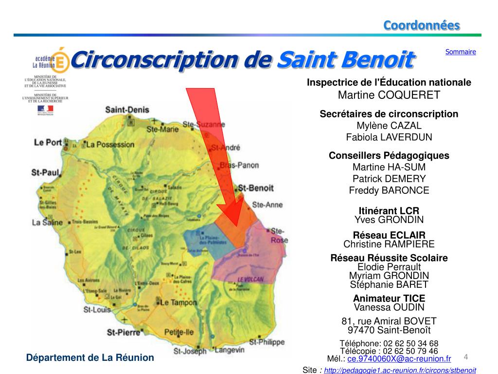 Coordonnées Circonscription de Saint Benoit Sommaire Inspectrice de l'Éducation nationale Martine COQUERET Secrétaires de circonscription Mylène CAZAL Fabiola LAVERDUN Conseillers Pédagogiques Martine HA-SUM Patrick DEMERY Freddy BARONCE Itinérant LCR Yves GRONDIN Réseau ECLAIR Christine RAMPIERE Réseau Réussite Scolaire Elodie Perrault Myriam GRONDIN Stéphanie BARET Animateur TICE Vanessa OUDIN 81, rue Amiral BOVET 97470 Saint-Benoît Téléphone: 02 62 50 34 68 Télécopie : 02 62 50 79 46 Mél.: ce.9740060X@ac-reunion.fr Site : http://pedagogie1.ac-reunion.fr/circons/stbenoit Département de La Réunion