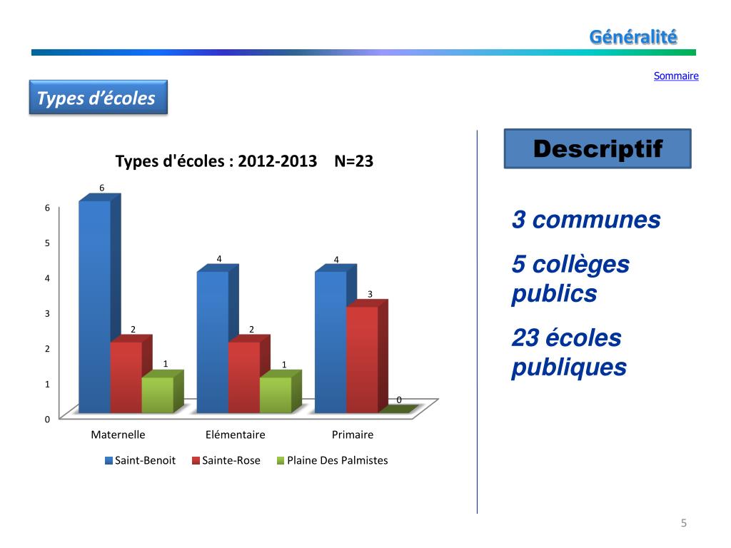 Généralité Sommaire Types d’écoles Descriptif 3 communes 5 collèges publics 23 écoles publiques